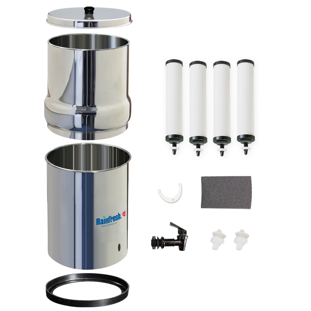 SM4 gravity ceramic water filter has two stainless steel containers, one on top of the other. Four ceramic filter cartridges are housed in the top container which is filled with untreated water. Water slowly passes through the ceramic cartridges under gravity where bacteria, cyst and other microbes are retained and killed. Also reduces microplastics. Safe water collects in the bottom container under gravity at a rate of up to 2.6 liters per hour.